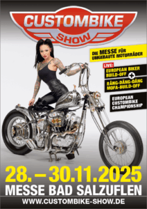 Es ist wieder soweit! Wir sind wieder in Bad Salzuflen auf der CUSTOMBIKE-SHOW! Vom 28.11.-30.11.2025 findet dort im Messezentrum (Hallen 20-22) die weltgrößte Messe für umgebaute Motorräder statt. Wir präsentieren Euch in Halle 20 Stand A22 unsere neuen Project Bikes sowie neue Parts rund um das Thema Fahrwerk.